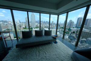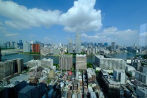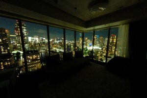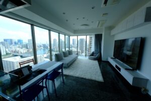 南西側に東京タワー、北東側にスカイツリーが眺める