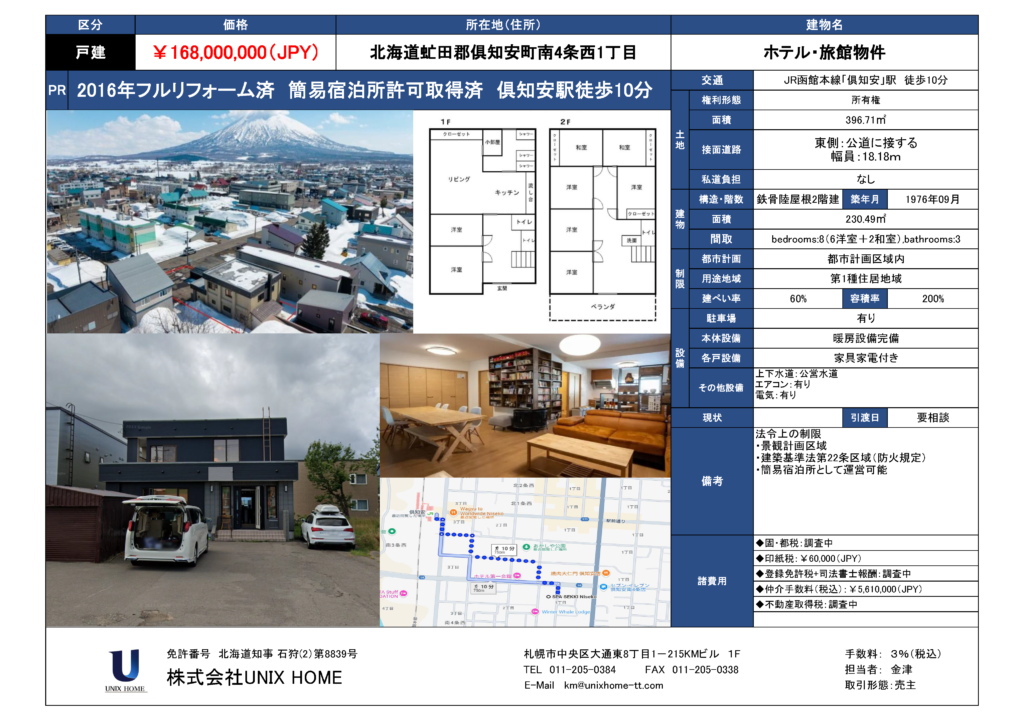 2016年フルリフォーム済 簡易宿泊所許可取得済 俱知安駅徒歩10分